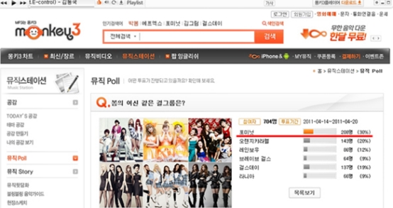 ÃÑ 704¸íÀÌ Âü¿©ÇÑ ÅõÇ¥ °á°ú Æ÷¹Ì´ÖÀÌ 30%(208¸í)ÀÇ µæÇ¥À²·Î 1À§¿¡ ¿Ã¶ú´Ù. Æ÷¹Ì´ÖÀº ÃÖ±Ù ½Å°î ¡®°Å¿ï¾Æ °Å¿ï¾Æ¡¯¿Í ¡®Heeart to Heart¡¯¸¦ ¹ßÇ¥ÇÏ¸é¼ ¼½½Ã, »óÅ, ¹ß¶ö µî ÆÈ»öÁ¶ ¸Å·ÂÀ» »Ë³»´Â º½ÀÇ ¿©½ÅÀ¸·Î º¯½ÅÇØ Àαâ¸ôÀ̸¦ Çϰí ÀÖ´Ù.