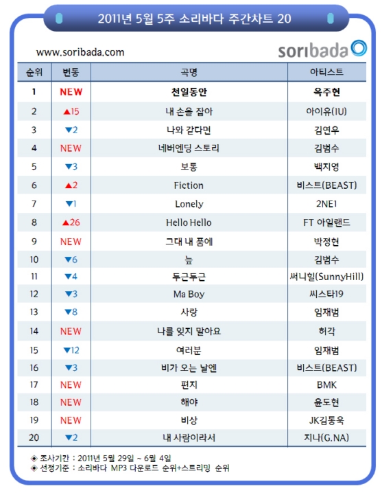 ¿Â¶óÀÎ À½¾Ç ¼ºñ½º ´ëÇ¥¾÷üÀÎ ¼Ò¸®¹Ù´Ù´Â ¿ÁÁÖÇöÀÇ 'õÀϵ¿¾È'ÀÌ 5¿ù ¸¶Áö¸· ÁÖ(5¿ù 29ÀÏ~ 6¿ù 4ÀÏ) ÁÖ°£Â÷Æ® 1À§¸¦ ¼®±ÇÇß´Ù°í ¹àÇû´Ù. ÀÌ·Î½á ¿ÁÁÖÇöÀº ¼Ö·Î °¡¼ö µ¥ºß ÀÌÈÄ Ã³À½À¸·Î À½¿øÂ÷Æ® Á¤»óÀ» Â÷ÁöÇÏ´Â ¿µ¿¹¸¦ ¾È°Ô µÆ´Ù.