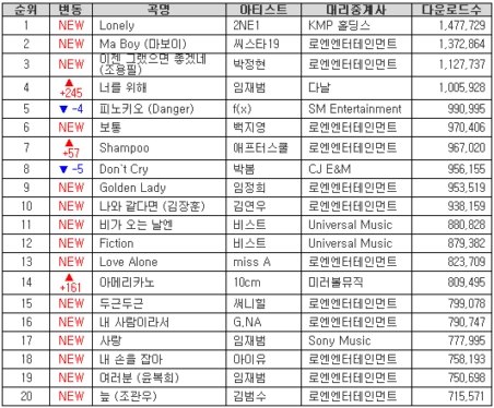 ´ëÇѹα¹ °øÀÎ À½¾ÇÂ÷Æ®ÀÎ °¡¿ÂÂ÷Æ®°¡ ±¹³» ÁÖ¿ä À½¾Ç»çÀÌÆ®¸¦ ´ë»óÀ¸·Î Áý°èÇÑ '5¿ù À½¿ø ´Ù¿î·Îµå Â÷Æ®' Áý°è(2011³â 5¿ù1ÀÏ~6¿ù4ÀÏ) °á°ú 'Lonely'(5¿ù12ÀÏ ¹ß¸Å)°¡ 147¸¸7729°ÇÀ» ±â·ÏÇϸç 1À§¸¦ Â÷ÁöÇß´Ù. 'Lonely'´Â '5¿ù ¼Â°ÁÖ ´Ù¿î·Îµå Â÷Æ®' 2À§·Î ù ÁøÀÔÇØ 2ÁÖÂ÷ÀÎ '5¿ù ³Ý°ÁÖ ´Ù¿î·Îµå Â÷Æ®'¿¡¼ 1À§¿¡ ¿Ã¶ó¼¸ç ²ÙÁØÇÑ Áõ°¡¼¼¸¦ º¸¿©¿Ô´Ù.