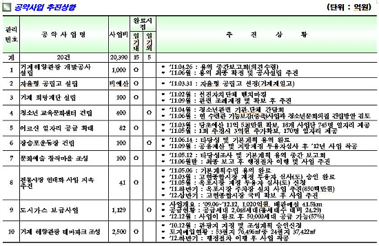 ÀÌ °¡¿îµ¥ Àӱ⠳»¿¡ °¡´ÉÇÑ °ø¾àÀº °ÅÁ¦Çؾç°ü±¤°³¹ß°ø»ç µî ¸ðµÎ 15°ÇÀ̰í, ÀÓ±â ÀÌÈÄ ¿Ï·áµÉ °ø¾àÀº û¼Ò³â ±³À°¹®È¼¾ÅÍ °Ç¸³, Àå½ÂÆ÷ ¿îµ¿Àå °Ç¸³ µî ¸ðµÎ 5°ÇÀÌ´Ù.