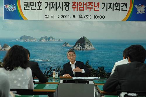 ±Ç¹ÎÈ£ °ÅÁ¦½ÃÀåÀÌ 14ÀÏ ¿ÀÀü 10½Ã °ÅÁ¦½Ãû ºê¸®Çη뿡¼ ÃâÀÔ±âÀÚµéÀ» »ó´ë·Î ÃëÀÓ 1Áֳ⠱âÀÚȸ°ßÀ» °¡Á³´Ù.