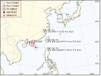±â»óû¿¡ µû¸£¸é "ÀÌ ÅÂdzÀº 21ÀÏ 15½Ã ÇöÀç, Á߽ɱâ¾Ð 996hPaÀÇ ¾àÇÑ ¼ÒÇüÅÂdzÀ¸·Î Á᫐ ºÎ±Ù¿¡¼ ÃÊ¼Ó 19mÀÇ °Ç³ÀÌ ºÒ°í ÀÖÀ¸¸ç, ½Ã¼Ó 14kmÀÇ ¼Óµµ·Î ¼ÁøÇϰí ÀÖ´Ù."¸ç, "ÅÂdzÀº 48½Ã°£(6¿ù 23ÀÏ 15½Ã) À̳»¿¡ Áß±¹ ³²ºÎÁö¹æ(ÀÜÀå ºÎ±Ù)À¸·Î ÁøÃâÇÏ¸é¼ ¿´ëÀú¾ÐºÎ·Î ¾à鵃 °ÍÀ¸·Î ¿¹»óµÈ´Ù."°í ¹àÇû´Ù.