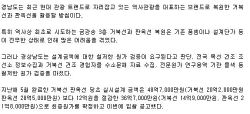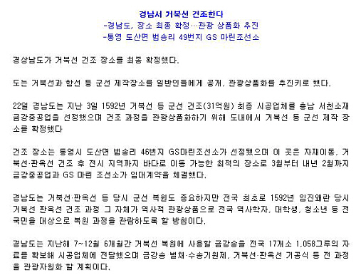 °æ³² Åë¿µÇØ°æÀº 21ÀÏ Àü¹®°¡¸¦ Ãʺù °ÅÁ¦½Ã Áö¼¼Æ÷¸¸¿¡ Á¤¹ÚÇØÀÖ´Â ¿øÇüº¹¿ø ¡®°ÅºÏ¼±¡¯ °ú Å뿵 µ¿È£¸¸¿¡ Àü½ÃµÈ ¡®ÆÇ¿Á¼±¡¯¿¡ »ç¿ëµÈ ¸ñÀçÀÇ ¿ø»êÁö¿Í ÀçÁúÀ» ¹àÈú °èȹÀÌ´Ù.
