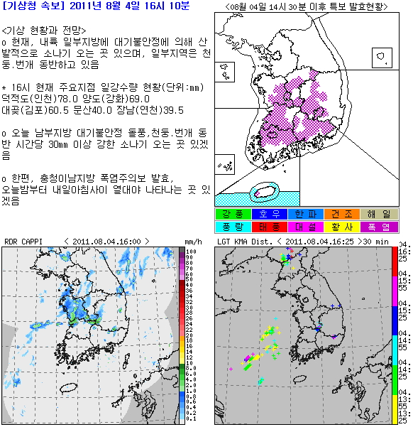 4ÀÏ ±â»óû¿¡ µû¸£¸é, Á¦9È£ ÅÂdz ¡®¹«ÀÌÆÄ(MUIFA)'°¡ 4ÀÏ 15½Ã ÇöÀç ÀϺ» ¿ÀŰ³ª¿Í ³²µ¿ÂÊ ¾à 210km ºÎ±Ù ÇØ»ó¿¡¼ ½Ã¼Ó 9km ¼Óµµ·Î ¼ÁøÇϰí ÀÖ´Ù(Á߽ɱâ¾Ð 945hPa, ÃÖ´ëdz¼Ó 45m/sÀÇ ¸Å¿ì °ÇÑ ´ëÇüÅÂdz).