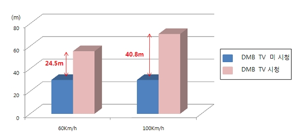 ½±°Ô ¸»Çؼ ½Ã¼Ó 60km·Î ÁÖÇàÇÑ´Ù°í °¡Á¤ÇßÀ» ¶§, DMB TV¸¦ º¸¸é¼ ÁÖÇàÇÏ´Â °æ¿ì µ¹¹ß»óȲ¿¡¼ Á¤Áö°Å¸®°¡ 24.5m³ª ±æ¾îÁø´Ù´Â ÀǹÌÀÌ´Ù. ±×¸¸Å »ç°í °¡´É¼ºÀÌ ³ô¾ÆÁø´Ù´Â ÀÇ¹Ì·Î ÇØ¼®ÇÒ ¼ö ÀÖ´Ù.