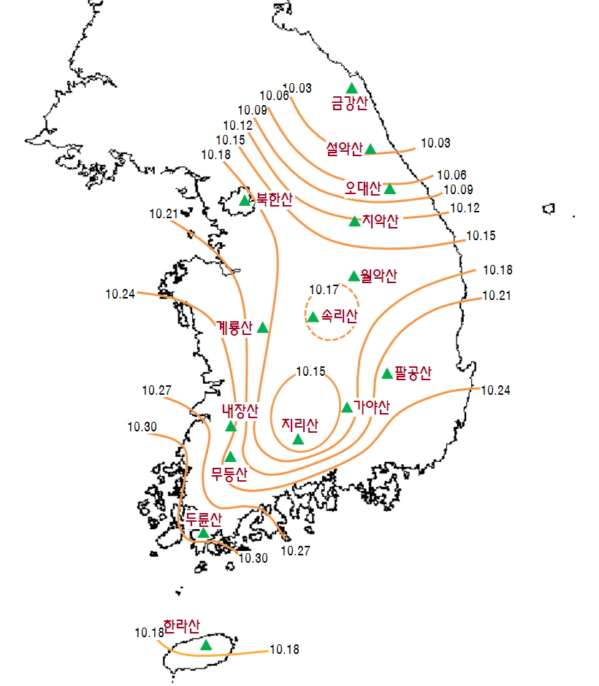 ±â»óûÀº "´Üdz ÀýÁ¤±â´Â ù ´Üdz ÀÌÈÄ º¸Åë 2ÁÖ Á¤µµ µÚ¿¡ ³ªÅ¸³ª´Âµ¥ ÁߺÎÁö¹æ°ú Áö¸®»ê¿¡¼ 10¿ù Áß¼øÈĹݢ¦Çϼø°æ¿¡, ³²ºÎÁö¹æ¿¡¼´Â 10¿ù¸» ~11¿ù »ó¼ø°æ¿¡ ³ªÅ¸³¯ °ÍÀ¸·Î ¿¹»óµÈ´Ù."°í ¹àÇû´Ù.