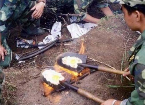 °ø°³µÈ »çÁø ¼Ó¿¡´Â ¿©·¯ ¸íÀÇ ±ºÀεéÀÌ ¸ð´ÚºÒ¿¡ ¾É¾Æ ÀÖ°í, ÇÑ ±ºÀÎÀÌ »ð¿¡ °è¶õÀ» ¾ñ¾î Àϸí '±º´ë½Ä °è¶õ ÈĶóÀÌ'¸¦ Áï¼®¿¡¼ ¸¸µé°í ÀÖ´Ù.
