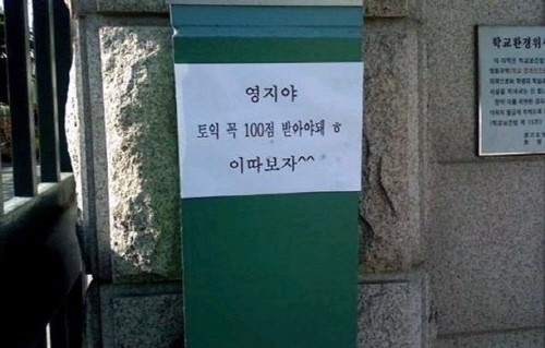 ³²ÀÚÄ£±¸°¡ ¿©ÀÚÄ£±¸ÀÇ ÅäÀͽÃÇèÀ» ÀÀ¿øÇϱâ À§ÇØ ÀûÀº °ÍÀ¸·Î º¸ÀÌ´Â ÀÌ »çÁøÀº ÅäÀÍ ½ÃÇèÀÇ ¸¸Á¡À» ÀϹݽÃÇèó·³ 100Á¡À¸·Î ¿ÀÇØÇÏ°í ±ÛÀ» ³²°Ü ´©¸®²ÛµéÀÇ Æø¼Ò¸¦ ÀھƳ´Ù.