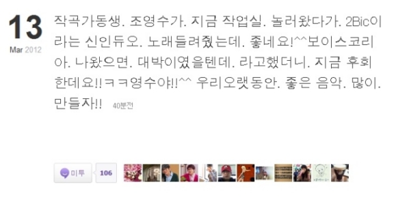 ½Å½ÂÈÆÀº Áö³ 13ÀÏ ¿ÀÈÄ 9½Ã 30ºÐ²² ÀÚ½ÅÀÇ SNS '¹ÌÅõµ¥ÀÌ'¸¦ ÅëÇØ "ÀÛ°î°¡µ¿»ý. Á¶¿µ¼ö°¡. Áö±Ý ÀÛ¾÷½Ç. ³î·¯¿Ô´Ù°¡. 2BicÀ̶ó´Â ½ÅÀεà¿À. ³ë·¡ µé·ÁÁá´Âµ¥. ÁÁ³×¿ä!^^º¸À̽ºÄÚ¸®¾Æ. ³ª¿ÔÀ¸¸é. ´ë¹ÚÀÌ¿´À»ÅÙµ¥. ¶ó°íÇß´õ´Ï. Áö±Ý ÈÄȸÇѵ¥¿ä!!¤»¤»¿µ¼ö¾ß!!^^ ¿ì¸®¿À·§µ¿¾È. ÁÁÀº À½¾Ç. ¸¹ÀÌ. ¸¸µéÀÚ!!"¶ó´Â ±ÛÀ» °ÔÀçÇÏ¸ç ½ÅÀεà¿À 2BiC¿¡ ´ëÇÑ ±â´ë°¨°ú Á¶¿µ¼ö¿¡ ´ëÇÑ ¹«ÇÑ ¾ÖÁ¤À» µå·¯³Â´Ù.