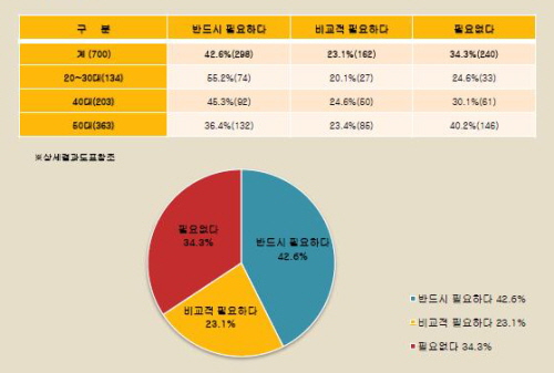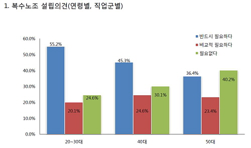º¹¼ö³ëµ¿Á¶ÇÕ ¼³¸³¿¡ °üÇÑ Áú¹®¿¡ ¡°¹Ýµå½Ã ÇÊ¿äÇÏ´Ù¡± 42.6%, ¡°ºñ±³Àû ÇÊ¿äÇÏ´Ù¡± 23.1%, ¡°ÇÊ¿ä¾ø´Ù¡± 34.3%·Î ³ªÅ¸³µ°í, ¿¬·ÉÀÌ ³ô¾ÆÁú¼ö·Ï º¹¼ö³ëÁ¶ ¼³¸³¿¡ ´ëÇÑ ÀÇÁö°¡ ¾àȵǴ °ÍÀ¸·Î Á¶»çµÆ´Ù.