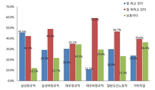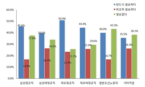 ±× ´ÙÀ½ ´ë¿ìÁ¶¼± ºñÁ¤±ÔÁ÷»ç¿ø 44.4%, »ï¼ºÁ¶¼± ºñÁ¤±ÔÁ÷»ç¿ø 39.6%, ÀϹݽùΠ35.6%, »ï¼º ºñÁ¤±ÔÁ÷»ç¿ø 34%, ´ë¿ì ºñÁ¤±ÔÁ÷»ç¿ø 29.6%, ´ë¿ì Á¤±ÔÁ÷»ç¿ø 25.7%°¡ ¡°º¹¼ö³ëÁ¶¼³¸³ÀÌ ÇÊ¿ä ¾ø´Ù¡± °í ´äº¯Çß´Ù.
