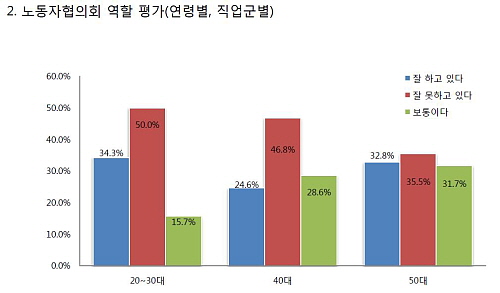 ³ëµ¿ÀÚÇùÀÇȸÀÇ ¿ªÇÒ¿¡ °¡Àå ºÎÁ¤Àû Æò°¡¸¦ ³»¸° Á÷¾÷±ºÀº ¾ç´ë Á¶¼±¼Ò ºñ Á¤±ÔÁ÷ »ç¿øµéÀÌ´Ù. ´ë¿ì ºñÁ¤±ÔÁ÷(59.2%), »ï¼º ºñÁ¤±ÔÁ÷(49.0%), ÀÏ¹Ý Á¶¼±³ëµ¿ÀÚ(46.7%)¼øÀ¸·Î ³ëµ¿ÀÚÇùÀÇȸ°¡ ¡°Àß ¸øÇϰí ÀÖ´Ù¡± °í ´äº¯Çß´Ù.