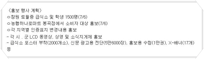 ±¹¸³³ó»ê¹°Ç°Áú°ü¸®¿ø °æ³²Áö¿ø(ÀÌÇÏ '°æ³²Ç°°ü¿ø' Áö¿øÀå ȲÀνÄ)Àº 2012³âºÎÅÍ º¯°æ ½ÃÇàµÈ ģȯ°æ³ó»ê¹° ÀÎÁõÇ¥Áö(Logo)ÀÇ ³»¿ë°ú ¾ÈÀüÇϰí ǰÁú ÁÁÀº ģȯ°æ¡¤GAP ÀÎÁõ ³ó»ê¹°ÀÇ ¿ì¼ö¼º µîÀ» ¼ÒºñÀÚ, Çлý, ¿µ¾ç»ç, ³ó¾÷ÀÎ ´ë»ó,7¿ù±îÁö ´Ù¾çÇÑ ¿Â¡¤¿ÀÇÁ¶ó¶óÀÎ ¸Åü¸¦ ÀÌ¿ëÇÑ Ã¼°èÀûÀ̰í Àû±ØÀûÀÎ È«º¸¸¦ ÃßÁøÇØ º¯°æÀÎÁõÇ¥Áö(Logo)¸¦ Á¶±â Á¤Âø½Ãų °èȹÀÌ´Ù.