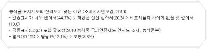 Áö±Ý±îÁö »ý»êÀÚ, ¼ÒºñÀÚ ¸ðµÎ Á¤ºÎÀÇ ³ó½Äǰ ÀÎÁõÁ¦µµÀÇ Á¾·ù°¡ ³Ê¹« ¸¹°í ÀÎÁõÀ» ¹ÞÀº Á¦Ç°ÀÓÀ» Ç¥½ÃÇϴ ǥÁöµµ ¸Å¿ì ´Ù¾çÇØ ±¸ºÐÀÌ Èûµé¾î ÀÎÁõ Ç¥Áö¸¦ ÅëÇÕÇÒ Çʿ䰡 ÀÖ´Ù´Â ÁöÀûÀÌ ²ÙÁØÈ÷ Á¦±âµÅ ¿Ô´Ù.