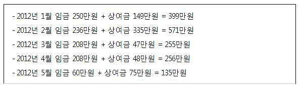 »çÀ§ÀÇ 5¿ù ±Þ¿©´Â 60¸¸7000¿ø, »ó¿©±ÝÀº 74¸¸6000¿øÀ¸·Î ÃÑ 135¸¸3000¿ø ¼öÁØ¿¡ ºÒ°úÇß´Ù.(¼Ò¸íÀÚ·á Áß ±Þ¿©´ëÀå ¹× »ó¿©´ëÀå)