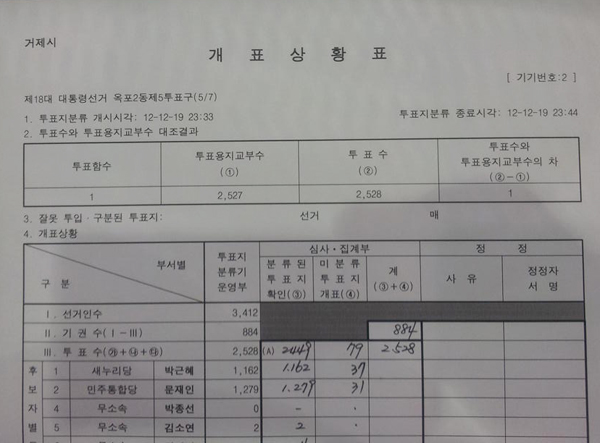 ÀÌ »óȲǥ¿¡´Â ÅõÇ¥¿ëÁö±³ºÎ¼ö´Â 2527Ç¥Àε¥ ÅõÇ¥¼ö´Â 2528Ç¥·Î 1Ç¥°¡ ´õ ¸¹Àº °ÍÀ¸·Î Áý°èµÅÀÖ´Ù.