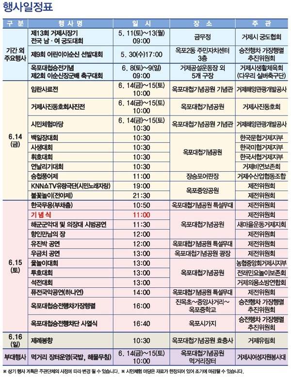 ÁÖ¿äÇà»ç·Î´Â Á¦13ȸ °ÅÁ¦½ÃÀå±â Àü±¹ ³².¿©±Ãµµ´ëȸ, Á¦9ȸ ¾î¸°ÀÌ À̼ø½Å ¼±¹ß´ëȸ, À̼ø½Å À屺¹è Ã౸´ëȸ, ÀÓ¶õ»ç·áÀü, ¹éÀÏÀå, »ç»ý´ëȸ, ½Ã¹Î³ë·¡ÀÚ¶û, À¯Áø¹Ú °ø¿¬, ÇØ±º±º¾Ç´ë ¹× ÀÇ»ó´ë ½Ã¹ü°ø¿¬, ¿ÁÆ÷´ëø½ÂÀüÇàÂ÷ °¡ÀåÇà·Ä µîÀÌ ¿¸°´Ù.