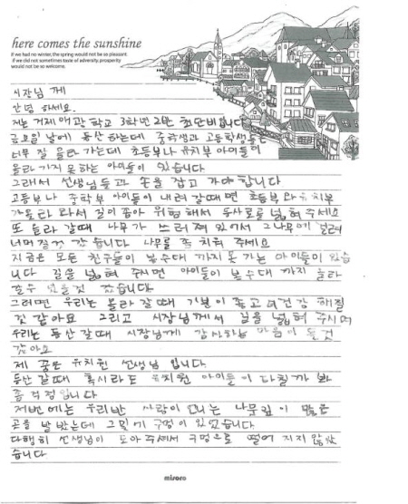 ¾Ö±¤Çб³ ÇлýÀº ¡°½ÃÀå´ÔÀÌ ¿ì¸®µéÀÇ ÆíÁö¸¦ º¸°í µî»ê·Î¸¦ Á÷Á¢ Á¤ºñµµ ÇØÁÖ°í, ÇÔ²² »êÇ൵ ÇØ Á༠³Ê¹« °¨»çÇÏ´Ù. ½ÃÀå´ÔÀÇ ¹è·Á¸¦ ÀØÁö ¾Ê°í ±â¾ïÇϰڴ١±°í ¸»Çß´Ù.