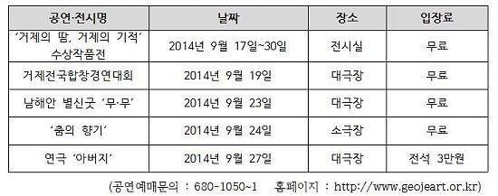 ¿¬±Ø ¡®¾Æ¹öÁö¡¯, ³²ÇØ¾È º°½Å±Â ¡®¹«¡¤¹«¡¯, ¡®ÃãÀÇ Çâ±â¡¯, ¡®°ÅÁ¦ÀÇ ¶¡, °ÅÁ¦ÀÇ ±âÀû¡¯ ¼ö»óÀÛǰÀü, °ÅÁ¦Àü±¹ÇÕâ°æ¿¬´ëȸ µî ½Ã¹ÎµéÀÌ Áñ±æ ¼ö ÀÖ´Â ´Ù¾çÇÑ ÇÁ·Î±×·¥À» ¼±º¸ÀδÙ.