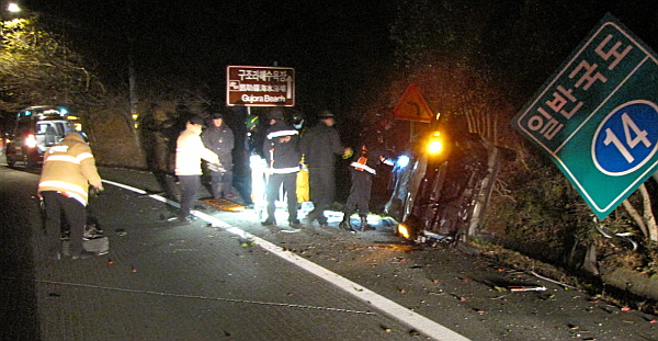 Áö³ 14ÀÏ ¹ã 11½Ã51ºÐ²² °æ³² °ÅÁ¦½Ã ÀÏ¿î¸é ¿ÍÇö¸® ±¹µµ»ó¿¡¼ Áö¼¼Æ÷¿¡¼ ±¸Á¶¶ó ¹æ¸éÀ¸·Î ¿îÇàÁßÀÌ´ø ½Â¿ëÂ÷°¡ µµ·ÎÇ¥ÁöÆÇ°ú Ãæµ¹ÇÏ¸é¼ Â÷·®ÀÌ ¹ÝÂë µÚÁý¾îÁö´Â »ç°í°¡ ¹ß»ýÇß´Ù.