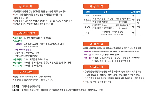 °ø¸ðÀü Âü°¡ ¹®ÀÇ´Â °ÅÁ¦½ÃÁ¾ÇÕ»çȸº¹Áö°ü ȨÆäÀÌÁö¿Í Àå¾ÖÀκ¹ÁöÆÀ °ø¸ðÀü ´ã´çÀÚ(055-636-0303)¿¡°Ô ¿¬¶ôÇÏ¸é µÈ´Ù.