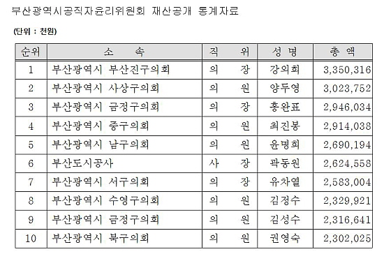 °ø°³´ë»óÀÚ Áß ºÎ»êÁø±¸ÀÇȸ °¿ÜÈñ ÀÇÀåÀÌ 33¾ï 5000¸¸ ¿øÀ¸·Î ÃÖ°í Àç»êº¸À¯ÀÚÀ̰í ÀÌ¾î »ç»ó±¸ÀÇȸ ¾çµÎ¿µ ÀÇ¿ø 30¾ï 2000¸¸ ¿ø, ±ÝÁ¤±¸ÀÇȸ È«¿ÏÇ¥ ÀÇÀå 29¾ï 4000¸¸ ¿ø ¼øÀ¸·Î ³ªÅ¸³µ´Ù