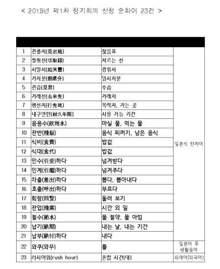½Ã´Â Áö³ ´Þ 30ÀÏ ±¹¾î¹Ù¸£°Ô¾²±âÀ§¿øÈ¸ Á¤±âȸÀǸ¦ ¿¾î ÀϺ»½Ä ÇÑÀÚ¾î¿Í ¿Ü·¡¾î µîÀ» ½ÉÀÇÇϰí ÀÌÁß 23°³ ¼øÈ¾î¸¦ ¼±Á¤․¹ßÇ¥Çß´Ù.