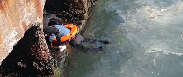 °ÅÁ¦¼Ò¹æ¼ ±¸Á¶´ë ¿Í Àå½ÂÆ÷¾ÈÀü¼¾ÅÍ ±¸±Þ´ë¿øµéÀÌ ÇöÀå¿¡ Ã⵿, ¹Ù´ÙÂÊ Çϼö±¸¿¡ ¸Å´Þ·Á ÀÖ´Â A¾¾¸¦ ¹ß°ß, ÇØ°æÀÇ µµ¿òÀ» ¹Þ¾Æ ±¸Á¶, ÀÀ±Þóġ ÈÄ Àαٺ´¿øÀ¸·Î À̼ÛÇß´Ù.