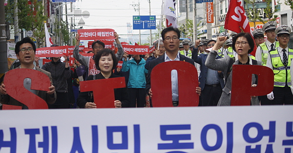 ¼Û¹Ì·® °ÅÁ¦½ÃÀÇ¿ø(³ëµ¿´ç) µî 4¸íÀº ¹Ù´Ù¿¡ ¶Ù¾îµé¾î ¸Å¸³Áß´ÜÀ» ÀǹÌÇÏ´Â ¡®STOP¡¯ öÀÚ ÇØ»óÇÇÄÏÆÃÀ» ¹úÀ̱⵵ Çß´Ù.