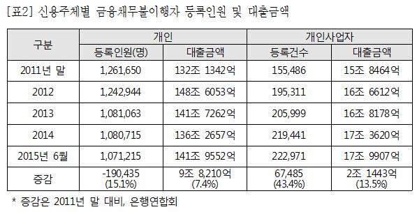 Ãֱ٠乫Á¶Á¤ È®´ë¿Í Àú±Ý¸® ±âÁ¶ ¼Ó¿¡ °³ÀÎ ±ÝÀ¶Ã¤¹«ºÒÀÌÇàÀÚ´Â ÁÙ¾îµé°í ÀÖ´Ù. 2011³â 126¸¸ ¸í¿¡ ´ÞÇß´ø ±ÝÀ¶Ã¤¹«ºÒÀÌÇàÀÚ´Â ±Ý³â 6¿ù 107¸¸ ¸íÀ¸·Î 19¸¸ ¸í(15%) °¨¼ÒÇß´Ù.