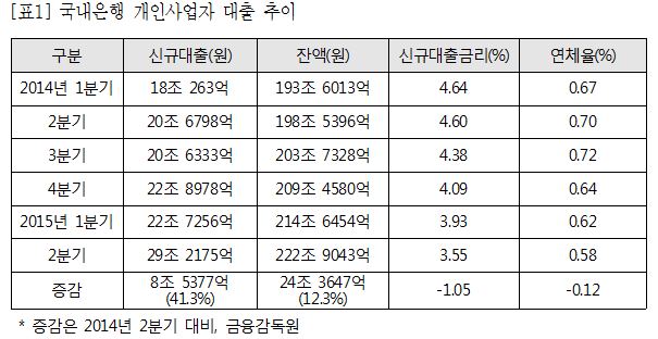 6¿ù¸» ±âÁØ, ±¹³»ÀºÇàÀÇ °³Àλç¾÷ÀÚ ´ëÃâÀܾ×Àº 222Á¶9043¾ï¿øÀ¸·Î Áý°èµÆ´Ù. °³Àλç¾÷ÀÚ ´ëÃâÀܾ×Àº 2011³â 6¿ù 150Á¶¿ø¿¡¼ 4³â ¸¸¿¡ Àý¹Ý °¡·®(73Á¶¿ø) ´Ã¾î³ °ÍÀÌ´Ù.