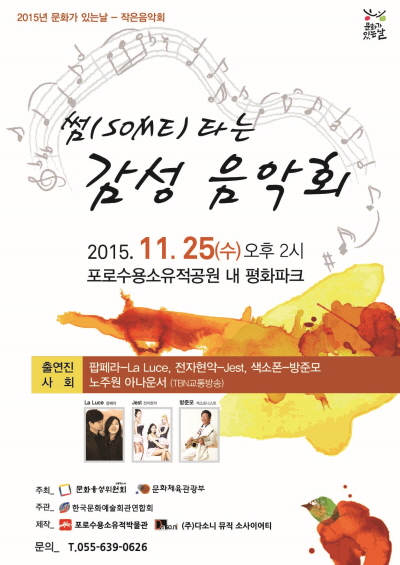 À½¾Çȸ´Â ¡®°ÅÁ¦ÀÇ Ãß¾ï(Memories of Geoje)¡¯î÷°ú ¿¬°èÇØ ³ëÁÖ¿ø ¾Æ³ª¿î¼(TBN ±³Åë¹æ¼Û)ÀÇ »çȸ·Î ÁøÇàµÇ¸ç, ÆËÆä¶ó °¡¼ö ¶ó·çü(La Luce)ÀÇ ¹ÂÁöÄà Áöų ¾Ø ÇÏÀÌµå ¡®Áö±Ý ÀÌ ¼ø°£¡¯, ¿ÀÆä¶ó »ç¶ûÀÇ ¹¦¾à ¡®³² ¸ô·¡ È긮´Â ´«¹°¡¯, ÀüÀÚÇö¾Ç Á¦½ºÆ®(Jest)ÆÀÀÇ ¡®¸®º£¸£ÅÊ°í¡¯, »ö¼ÒÆ÷´Ï½ºÆ® ¹æÁظðÀÇ ¡®²É¹ç¿¡¼¡¯ µî Ŭ·¡½ÄºÎÅÍ ¹ÂÁöÄÃ, ¿µÈÀ½¾Ç µî ´Ù¾çÇÑ À帣ÀÇ À½¾ÇÀ» ¼±º¸ÀδÙ.