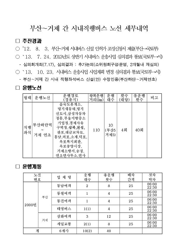 À̹ø ÆÇ°á·Î °ÅÁ¦~ºÎ»ê °£ÀÇ ÃÖÃÊÀÇ ±¤¿ª ½Ã³»¹ö½º³ë¼±ÀÇ Àΰ¡¿Í ¿îÇà°ú °ü·ÃµÈ ¸ðµç ÀÏ·ÃÀÇ ÀýÂ÷ µî¿¡ ´ëÇØ Á¦µµÀû, ¹ýÀûÀÎ ±Ù°Å°¡ ´ë¿ÜÀûÀ¸·Î È®º¸µÅ ¾ÕÀ¸·Î ÀÌ ³ë¼±ÀÇ À̿밴 Áõ°¡¿¡ µû¸¥ Â÷·®ÁõÂ÷ ¹× ³ë¼±ºÐ¸® µî, ¾ç ½Ãµµ ½Ã¹ÎµéÀÇ ÀÌ¿ëÆíÀǸ¦ À§ÇÑ ³ë¼±ÀÇ È¿À²¼º ¹× È®´ë ÃßÁø µî¿¡ ź·ÂÀ» ¹Þ°ÔµÆ´Ù.