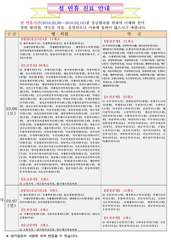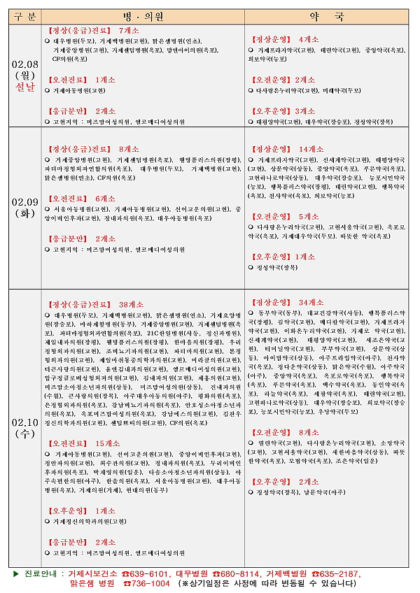 °ÅÁ¦½Ã´Â ¼³ ¿¬ÈÞ°¡ ½ÃÀ۵Ǵ ¿À´Â 2¿ù 6ÀϺÎÅÍ 10ÀϱîÁö ¼³ ¿¬ÈÞ ´ç¹ø º´ÀÇ¿ø ¹× ¾à±¹À» ÁöÁ¤ ¿î¿µÇÑ´Ù.