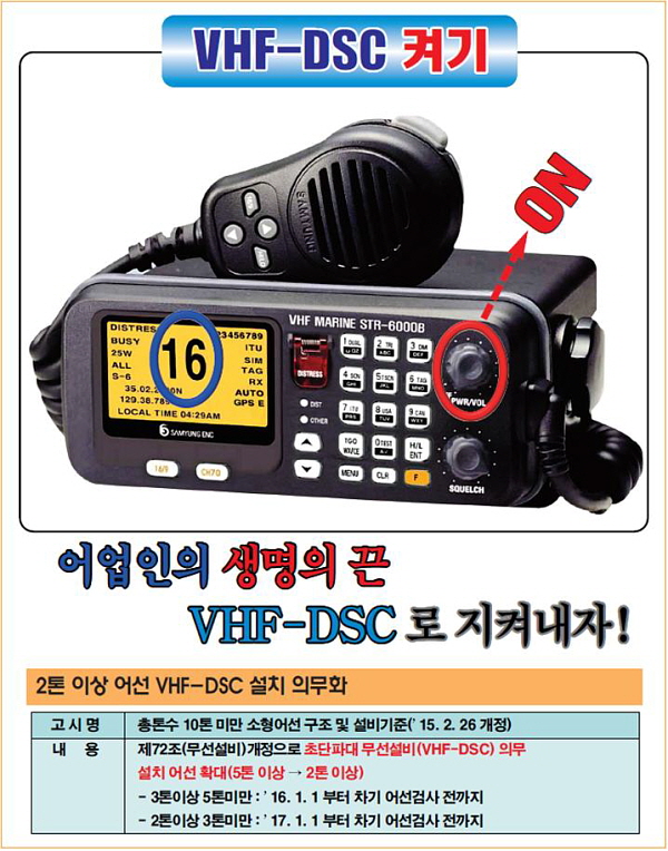 Áö³ 2010³â 7¿ù1ÀÏ ¾î¼±¹ý °³Á¤¿¡ µû¶ó 5Åæ ÀÌ»óÀÇ ¸ðµç ¾î¼±¿¡ VHF-DSC ¼³Ä¡°¡ Àǹ«ÈµÆÀ¸¸ç 2016³â ºÎÅÍ 3Åæ ÀÌ»ó 5Åæ ¹Ì¸¸ÀÇ ¾î¼±, 2017³â ÀÌÈÄ 2Åæ ÀÌ»ó ¾î¼±À¸·Î ¼³Ä¡Àǹ«°¡ È®´ëµÈ´Ù.