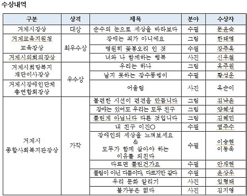 ÀÀ¸ðµÈ ÀÛǰÀº °ÅÁ¦½ÃÀå¾ÖÀδÜüÃÑ¿¬ÇÕȸ ¼Õº¹½Ä ȸÀå°ú °ÅÁ¦½ÃÀå¾ÖÀο¬¸Í ¾È¼øÀÚ È¸Àå, °ÅÁ¦½ÃÈñ¸Áº¹ÁöÀç´Ü °½ÂÇÊ »ç¹«±¹Àå, âȣÃʵîÇб³ ¹èÀç±Õ ±³»ç µî Áö¿ª Àü¹®°¡µéÀÇ ½Éµµ ±íÀº ½É»ç¸¦ °ÅÃÄ ¹®À±¼÷ ¾¾ÀÇ ¡®¼ø¼öÀÇ ´«À¸·Î Àå¾Ö¸¦ ¹Ù¶óº¸´Ù¡¯ ¼öÇÊÀÌ ´ë»óÀ¸·Î ¼±Á¤µÇ´Â µî ÃÑ 16ÀÛǰÀÌ ¼ö»óÇß´Ù.