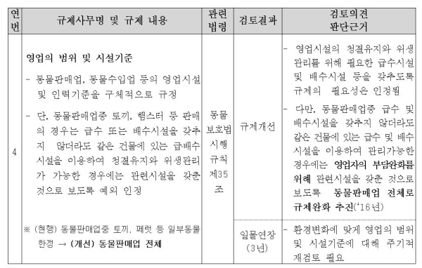¶ÇÇÑ, µ¿¹°ÆÇ¸Å¾÷ ½Ã¼³ ¹× Àη±âÁØ Áß Åä³¢, Æä·µ, ±â´ÏÇǽº, ÇܽºÅ͸¦ ÆÇ¸ÅÇÏ´Â °æ¿ì¿¡´Â ±Þ¼ö½Ã¼³ ¶Ç´Â ¹è¼ö½Ã¼³À» °®ÃßÁö ¾Ê´õ¶óµµ °°Àº °Ç¹°¿¡ ÀÖ´Â ±Þ¼ö½Ã¼³ ¹× ¹è¼ö½Ã¼³À» ÀÌ¿ë, û°áÀ¯Áö¿Í À§»ý°ü¸®°¡ °¡´ÉÇÑ °æ¿ì ÇÊ¿äÇÑ ±Þ¼ö½Ã¼³ ¹× ¹è¼ö½Ã¼³À» °®Ãá °ÍÀ¸·Î º¸°í ÀÖÀ¸³ª, ±Þ¼ö ¹× ¹è¼ö½Ã¼³À» °®ÃßÁö ¾Ê´õ¶óµµ °°Àº °Ç¹°¿¡ ÀÖ´Â ±Þ¼ö ¹× ¹è¼ö½Ã¼³À» ÀÌ¿ëÇØ °ü¸®°¡´ÉÇÑ °æ¿ì¿¡´Â ¿µ¾÷ÀÚÀÇ ºÎ´ã¿Ïȸ¦ À§ÇØ °ü·Ã½Ã¼³À» °®Ãá °ÍÀ¸·Î º¼ ¼ö ÀÖµµ·Ï µ¿¹°ÆÇ¸Å¾÷ Àüü·Î ±ÔÁ¦¿Ïȸ¦ ÃßÁøÇϰí Àϸô ±âÇÑÀ» ¿¬ÀåÇϱâ·Î Çß´Ù.