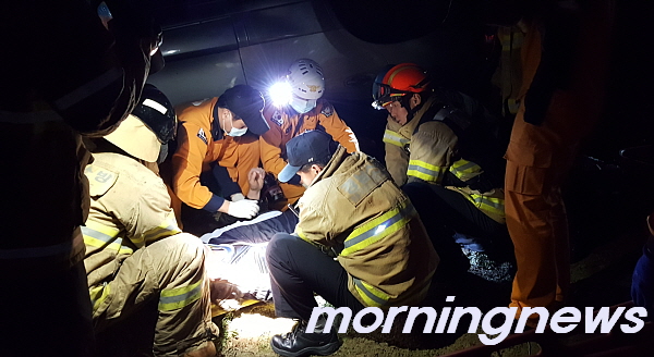 Å뿵¼Ò¹æ¼ 119±¸Á¶´ë°¡ Àüº¹Â÷·®¿¡¼ ºÎ»ó´çÇÑ ¿îÀüÀÚ¿Í µ¿½ÂÀÚ¸¦ ±¸Á¶Çϰí ÀÖ´Ù.