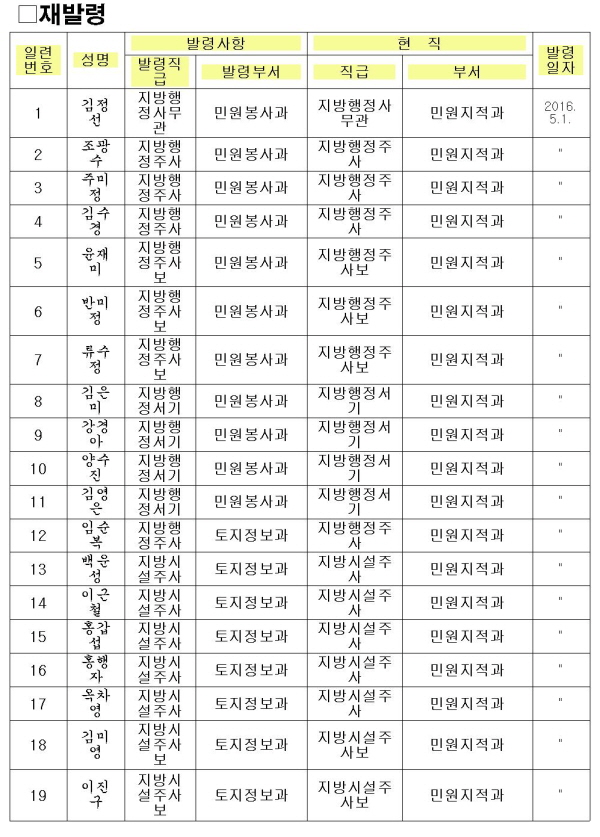 ÀÌ¿ÍÇÔ²² ¹Î¿øºÀ»ç°ú¿Í ÅäÁöÁ¤º¸°ú·Î ºÐ¸®µÇ´Â ¹Î¿øÁöÀû°ú Á÷¿ø°ú Àå½ÂÆ÷µ¿¿¡ ÅëÇյǴ ¸¶Àüµ¿ Á÷¿ø µî 37¸íÀ» °¢ Àç¹ß·É Çß´Ù. ¹ß·ÉÀÏÀÚ´Â ¿À´Â 5¿ù 1ÀÏÀÌ´Ù.