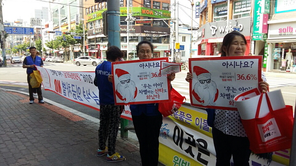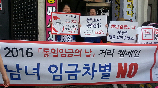 °ÅÁ¦YWCA(ȸÀå ±èº¹·Ê)´Â 23ÀÏ °íÇö½ÃÀå »ç°Å¸®¿¡¼ °í¿ëÆòµîÁÖ°£(5¿ù ¸¶Áö¸· ÁÖ)À» ¸Â¾Æ OECD ±¹°¡ Áß ÃÖÇÏÀ§ÀÎ ¿ì¸®³ª¶ó ³²³àÀÓ±Ý °ÝÂ÷ ÇØ¼Ò¸¦ ¸ñÇ¥·Î ¡®µ¿ÀÏÀÓ±ÝÀÇ ³¯¡¯ Á¦Á¤À» Ã˱¸Çϰí, »çȸ °ø°¨´ë¸¦ ÀÌ·ç±â À§ÇÑ Ä·ÆäÀÎÀ» ¹ú¿´´Ù.