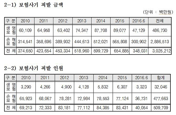 ±è ÀÇ¿øÀÌ ±ÝÀ¶°¨µ¶¿ø¿¡¼ Á¦Ãâ¹ÞÀº ¡®2010³âºÎÅÍ 2016³â 6¿ù±îÁö ¿¬µµº° º¸Çè»ç±â »ç°Ç ¹ß»ýÇöȲ¡¯ ¿¡ µû¸£¸é Áö³ 2010³âºÎÅÍ 2016³â 6¿ù±îÁö º¸Çè»ç±â Àû¹ß±Ý¾×ÀÌ »ýº¸¿Í ¼Õº¸¸¦ ÇÕÃļ ÃÑ 3Á¶ 252¾ï¿øÀ̰í, Àû¹ßÀοøµµ 46¸¸ 9655¸í¿¡ À̸£°í ÀÖ¾ú´Ù.