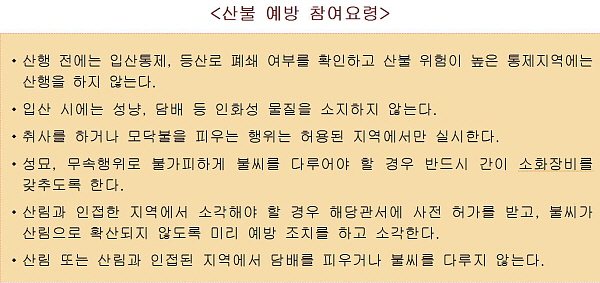 ±¹¹Î¾ÈÀüó´Â »êºÒ¿¹¹æÀ» À§Çؼ¡°»ê¸²°ú ÀÎÁ¢ÇÑ Áö¿ª¿¡¼ ¾²·¹±â µîÀ» ¼Ò°¢ ÇÒ ¶§´Â ÇØ´ç°ü¼¿¡ »çÀü Çã°¡¸¦ ¹Þ¾Æ¾ß Çϸç, »ê¸²Àαٿ¡¼ ÀÚµ¿Â÷¸¦ Ÿ°í °¡´Â Áß¿¡ ´ã¹è²ÇÃʸ¦ ÇԺηΠ¹ö·Á¼µµ ¾ÈµÈ´Ù¡±°í °Á¶Çß´Ù.