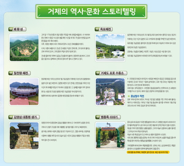 °ÅÁ¦½Ã °ü±¤ ¾È³»µµ´Â °ÅÁ¦8°æ°ú Æó¿Õ¼º, ¿ÁÆ÷ÇØÀü, ĥõ·®ÇØÀü, °ÅÁ¦µµ Æ÷·Î¼ö¿ë¼Ò, Èﳲö¼öÀÛÀü, ±è¿µ»ï ´ëÅë·É»ý°¡, ¸ÍÁ¾Á× µî °ÅÁ¦ÀÇ ¿ª»ç ¹®È À̾߱â·Î ±¸¼ºµÇ¾î ÀÖ´Ù.