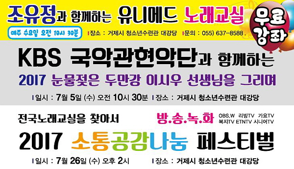 1źÀº 7¿ù 5ÀÏ(¼ö) °ÅÁ¦½Ãû¼Ò³â¼ö·Ã°ü¿¡¼ ÆîÃÄÁö´Â ¿©Àǵµ KBS º»±¹ ±¹¾Ç°üÇö¾Ç´Ü ¡®2017 ´«¹° Á¥Àº µÎ¸¸° ÀÌ½Ã¿ì ¼±»ý´ÔÀ» ±×¸®¸ç(5ȸ)¡¯ ÃÊû°ø¿¬À̰í, 2źÀº °°Àº´Þ 26ÀÏ(¼ö) °°Àº Àå¼Ò¿¡¼ ¿¸®´Â Àü±¹ À¯´Ï¸Þµå³ë·¡±³½ÇÀ» ã¾Æ ´Ù´Ï¸ç ´ëÁß°ø¿¬¿¹¼úÀÇ Áø¼ö¸¦ ÆîÄ¡´Â ¡®2017 ¼ÒÅë°ø°¨³ª´® Æä½ºÆ¼¹ú¡¯ÀÌ´Ù.