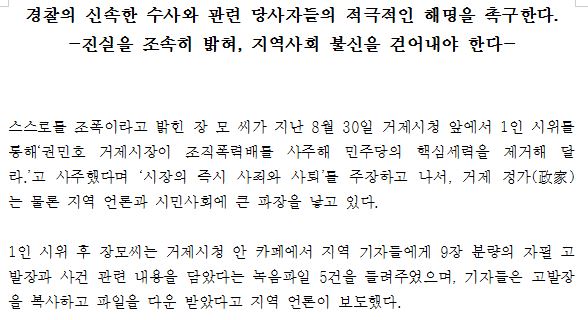 °ÅÁ¦Áö¿ª ½Ã¹Î´ÜüµéÀÌ °ÅÁ¦Á¤°¡¿Í ½Ã¹Î»çȸ¿¡ Å« ÆÄÀåÀ» ³º°í ÀÖ´Â ¡®°ÅÁ¦½ÃÀå Æø·Â¹è ¹ÎÁÖ´ç Çٽɼ¼·Â Á¦°Å »çÁÖ¼³¡¯ ¿¡ ´ëÇÑ °æÂûÀÇ ½Å¼ÓÇÑ ¼ö»ç¿Í °ü·Ã ´ç»çÀÚµéÀÇ Àû±ØÀûÀÎ ÇØ¸íÀ» Ã˱¸Çß´Ù.