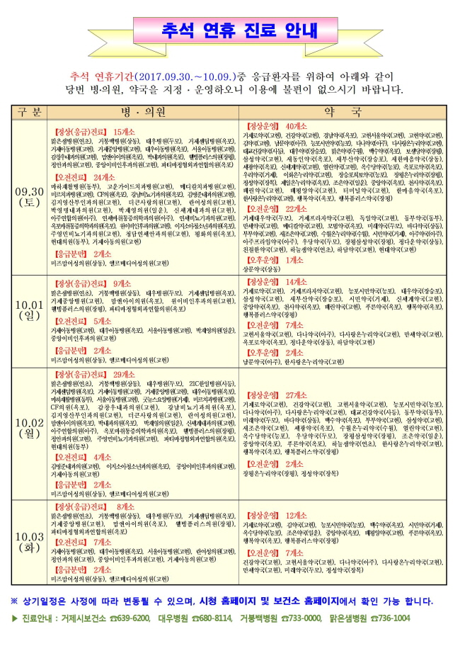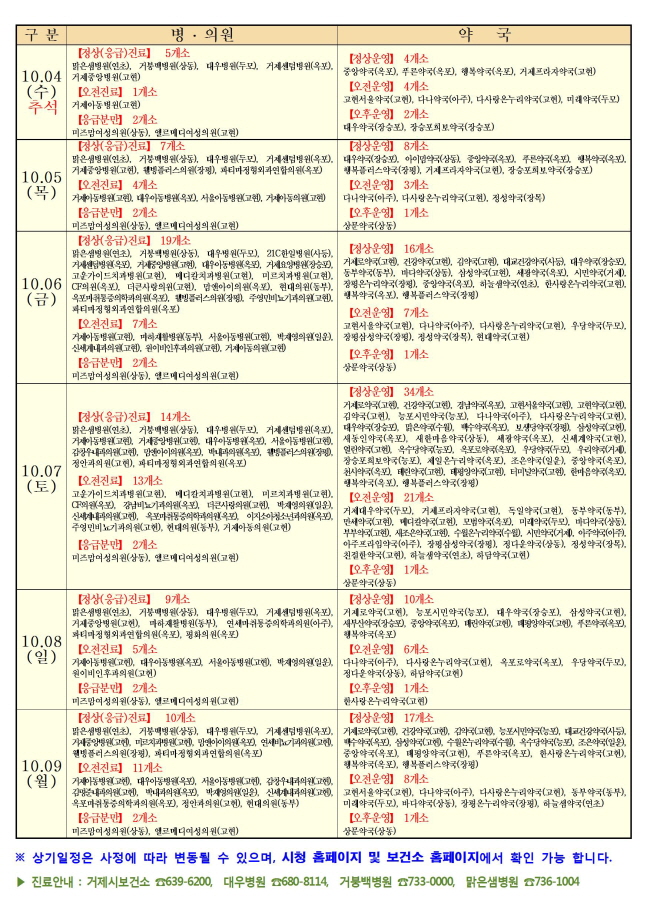 °ÅÁ¦½Ã°¡ Ãß¼®¿¬ÈÞ ±â°£(9¿ù30ÀÏ~10¿ù9ÀÏ) ÀÀ±ÞȯÀÚ¸¦ À§ÇÑ ´ç¹ø º´.ÀÇ¿ø ¹× ¾à±¹À» ÁöÁ¤ ¿î¿µÇÑ´Ù°í 21ÀÏ ¹àÇû´Ù.