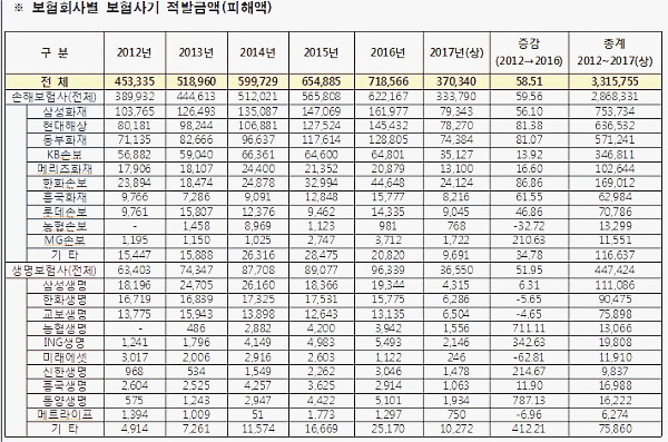 µ¿¾ç»ý¸íÀº 2012³â 5¾ï 7500¸¸¿øÀÌ´ø º¸Çè»ç±â ÇÇÇØ±Ý ±Ô¸ð°¡ 2016³â 51¾ï¿øÀ¸·Î ´Ã¾î 787%ÀÇ Áõ°¡À²À» º¸ÀÌ¸ç º¸Çè»çº° ÃÖ´ë Áõ°¡À²À» ±â·ÏÇß°í, ³óÇù»ý¸í(711%), ING»ý¸í(342%), ½ÅÇÑ»ý¸í(214%)ÀÌ µÚ¸¦ À̾ú´Ù.