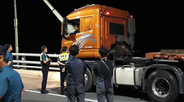 ¸¸Ãë»óÅ·Π25Åæ Æ®·¹ÀÏ·¯¸¦ ¹°°í °Å°¡´ë·Î¿¡¼ ³µ¿À» ºÎ¸° ȹ°Â÷ ¿îÀüÀÚ°¡ °æÂûƯ°ø´ë°¡ ÅõÀԵǴ ¼Òµ¿ ³¡¿¡ üÆ÷µÆ´Ù.