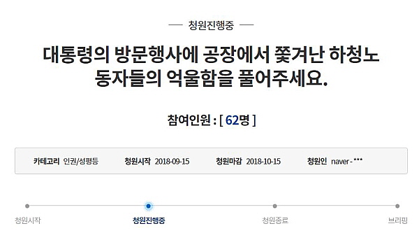 ¡Ø ¹®ÀçÀÎ ´ëÅë·ÉÀÇ ¹æ¹®À¸·Î °øÀå¿¡¼ ³»Âѱâ°í °Á¦¿¬Â÷ »ç¿ë°ú ¹«±ÞÀ» °¿ä´çÇÑ ÇÏû³ëµ¿ÀÚÀÇ ¾ï¿ïÇÔÀ» Ç®¾î´Þ¶ó´Â û¿Í´ë ±¹¹Îû¿øÀÌ ÁøÇà ÁßÀÔ´Ï´Ù.