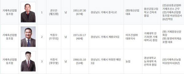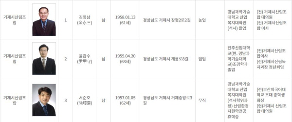 °ÅÁ¦»ê¸² Á¶ÇÕÀå ¼±°Å´Â ±è¿µ»ï(61) Àü °ÅÁ¦»ê¸²Á¶ÇÕ ÀÌ»ç, À±°©¼ö(63) Àü °ÅÁ¦½Ã »ê¸²³ìÁö°úÀå, ¼ÁØÈ£ Çö °ÅÁ¦»ê¸²Á¶ÇÕ ´ëÀÇ¿øÀÌ 3ÆÄÀüÀ» ¹úÀδÙ.